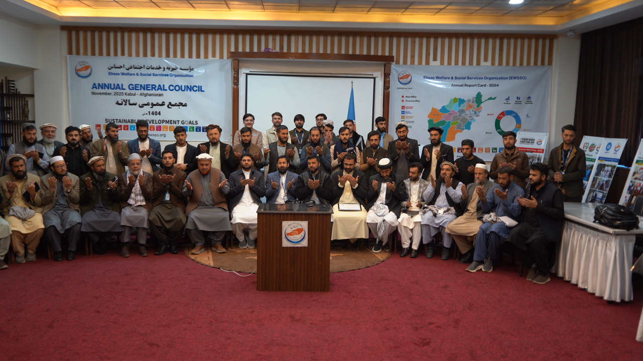 Our ProgramsA non-profit relief and development organizationAllEmergency ResponseSocial ServicesEducationWomen EmpowermentDevelopmentEnvironmental ProtectionHealthcareQurbani and RamadanLivelihoodAllAll ProgramsGeneral Council of Ehsas Welfare & Social Services Organization – 2025The General Council of Ehsas Welfare & Social Services Organization was held on sept, 2025 with the participation of scholars,… Read More Capacity Building Seminar of Ehsas Welfare & Social Services OrganizationThe Capacity Building Seminar of Ehsas Welfare & Social Services Organization was held on September, 2025 with the participation of… Read More Emergency Cooked Meal Distribution to 15000 Afghan Returnees from IranProject Overview: The Ehsas Welfare and Social Services Organization (EWSSO), with the generous support of the IHH Humanitarian Relief Foundation,… Read More Hot Meal Distribution to 1950 Afghan Returnees from IranProject Overview: The Ehsas Welfare and Social Services Organization (EWSSO) successfully implemented a humanitarian project in Herat province, where warm,… Read More Empowering Communities through Tailoring SkillsRead More Inauguration of Masjid for Earthquake-Affected Families in Herat ProvinceRead More Community Kitchen Program in Bamyan provinceEWSSO, in partnership with UNDP, successfully carried out the Community Kitchen Program in Bamyan Province, providing daily meals to 300… Read More Inauguration of Naw-Abad Town for Earthquake-Affected Families in Herat ProvinceThe official inauguration of Naw-Abad Town in Herat Province represents a major milestone in the ongoing relief efforts for families… Read More Ehsas Welfare and Social Services Organization (EWSSO) has Constructed an orphanage in Paktika Province Read More Hand-Over Ceremony of Constructed House to the Family of Orphans in Logar ProvinceHand-Over Ceremony of Constructed House to the Family of Orphans in Logar Province Read More Slaughter of 200 Cows for Vulnerable & Returnee Families in Kabul and Nangarhar provinceAfghanistan remains one of the most impoverished Islamic nations, facing severe hardship, particularly in these difficult times. Famine, hunger, and… Read More EWSSO distributed 96 kg meat for vulnerable and returnees families in Logar Province of Afghanistan.Project Overview: The Ehsas Welfare and Social Services Organization (EWSSO) successfully carried out the Qurbani Project, a significant Sunnah practice… Read More Emergency ResponseEmergency ResponseEmergency Cooked Meal Distribution to 15000 Afghan Returnees from IranProject Overview: The Ehsas Welfare and Social Services Organization (EWSSO), with the generous support of the IHH Humanitarian Relief Foundation,… Read More Hot Meal Distribution to 1950 Afghan Returnees from IranProject Overview: The Ehsas Welfare and Social Services Organization (EWSSO) successfully implemented a humanitarian project in Herat province, where warm,… Read More Distribution of Food Packages to Flood Victims in Badghis Province on June 1, 2024EWSSO Provides Critical Food Aid to Flood-Affected Families in Badghis Province On June 1, 2024, the Ehsas Welfare and Social… Read More EWSSO Brings Lifeline of Clean Water to Baghlan ProvinceIntroduction: On February 22, 2024, the Ehsas Welfare and Social Services Organization (EWSSO) took a pivotal step towards addressing the… Read More Social ServicesSocial ServicesCommunity Kitchen Program in Bamyan provinceEWSSO, in partnership with UNDP, successfully carried out the Community Kitchen Program in Bamyan Province, providing daily meals to 300… Read More Distribution of Food Packages to 60 needy families in KabulINTRODUCTION As we know that the majority of individuals in Afghanistan are experiencing severe food insecurity, economic sanctions and famines… Read More Distribution of Food Packages to Flood Victims in Badghis Province on June 1, 2024EWSSO Provides Critical Food Aid to Flood-Affected Families in Badghis Province On June 1, 2024, the Ehsas Welfare and Social… Read More Distribution of Blankets, Shoes, and Winter Fuel to Deserving Families in Ghor Province on May 30, 2024Ehsas Welfare and Social Services Organization (EWSSO) Provides Essential Aid On May 30, 2024, Ehsas Welfare and Social Services Organization… Read More Distribution of Food Packages to Flood Victims in Ghor Province on May 29, 2024Ehsas Distributes Essential Food Items to 100 Flood-Affected Families On May 29, 2024, Ehsas carried out a significant humanitarian effort… Read More Distribution of Cooked Meals to Flood Victims in Ghor Province on May 28, 2024EWSSO Provides Essential Relief to Flood Victims in Ghor Province On May 28, 2024, the Ehsas Welfare and Social Services… Read More EWSSO Brings Warmth and Comfort to Bamiyan ProvinceIntroduction: On May 28, 2024, the Ehsas Welfare and Social Services Organization (EWSSO) embarked on a mission to bring warmth… Read More Distribution of Cooked Meals to Flood Victims in Baghlan Province on May 25, 2024EWSSO Provides Critical Support to Flood Victims in Baghlan Province On May 25, 2024, the Ehsas Welfare and Social Services… Read More Manar Association’s Aid from Germany for Widows and Orphans in AfghanistanIntroduction: In December 2021, the Manar Association of Afghan Sisters, based in Germany, continued their noble initiative of providing aid… Read More EWSSO Brings Lifeline of Clean Water to Baghlan ProvinceIntroduction: On February 22, 2024, the Ehsas Welfare and Social Services Organization (EWSSO) took a pivotal step towards addressing the… Read More EWSSO Welcomes Afghan Returnees with Heartfelt Food AssistanceIntroduction: On February 22, 2024, the Ehsas Welfare and Social Services Organization (EWSSO) extended a helping hand to Afghan returnees… Read More EWSSO Brings Clean Water Hope to Kunar ProvinceIntroduction: On February 12, 2024, the Ehsas Welfare and Social Services Organization (EWSSO) took a pivotal step towards addressing the… Read More